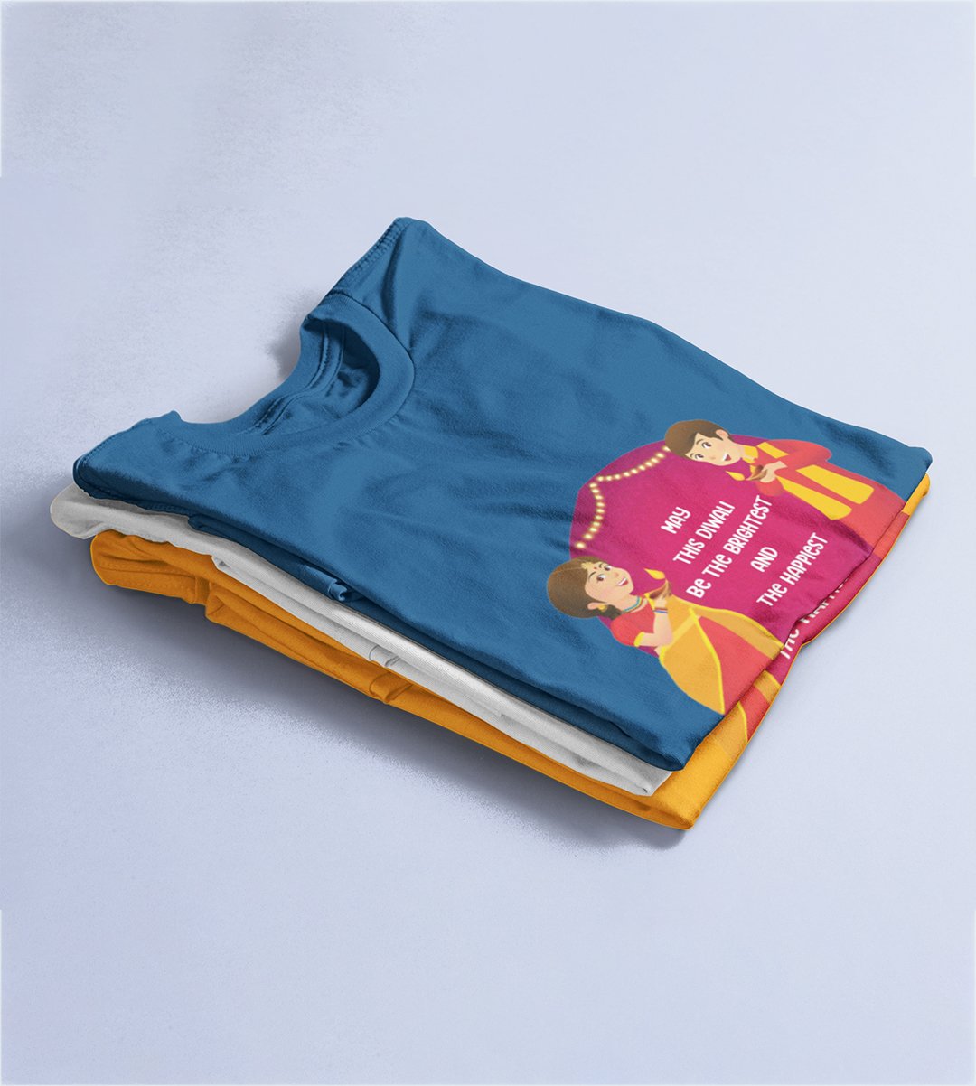 Traditional dressup happy couple printed diwali themed unisex round neck blended blue t-shirt specially for diwali festival
